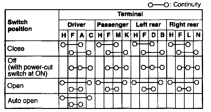 1. Remove the power window main switch.2. Inspect for continuity between the terminals of the power window main switch connector with the main switch in the following positions.