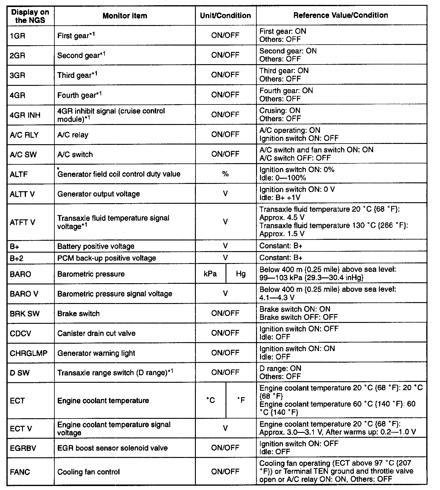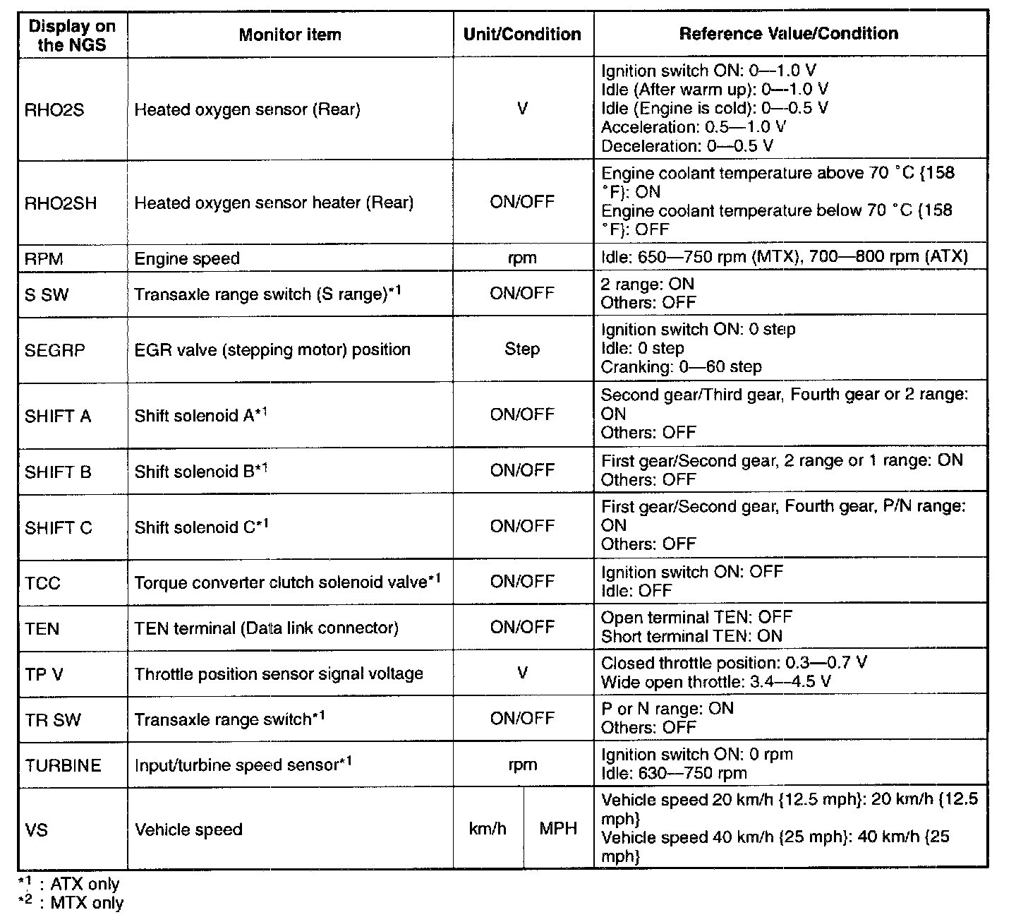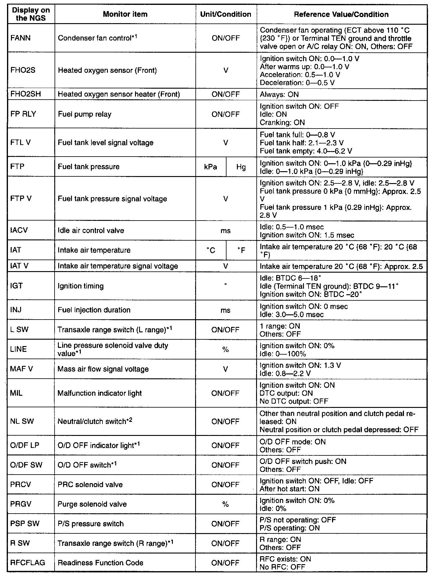 NOTE: The "PID/DATA MONITOR AND RECORD" function is to monitor the calculation value of input/output signals in the PCM. Deviation in the value does not always indicate malfunction in the related input/output devices (sensors and solenoids).