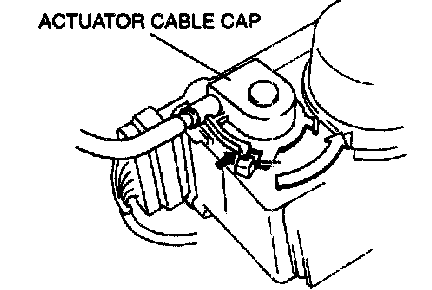 Remove the actuator cable cap from the cruise actuator by pushing the actuator cable cap tab and rotating the actuator cable cap counterclockwise.