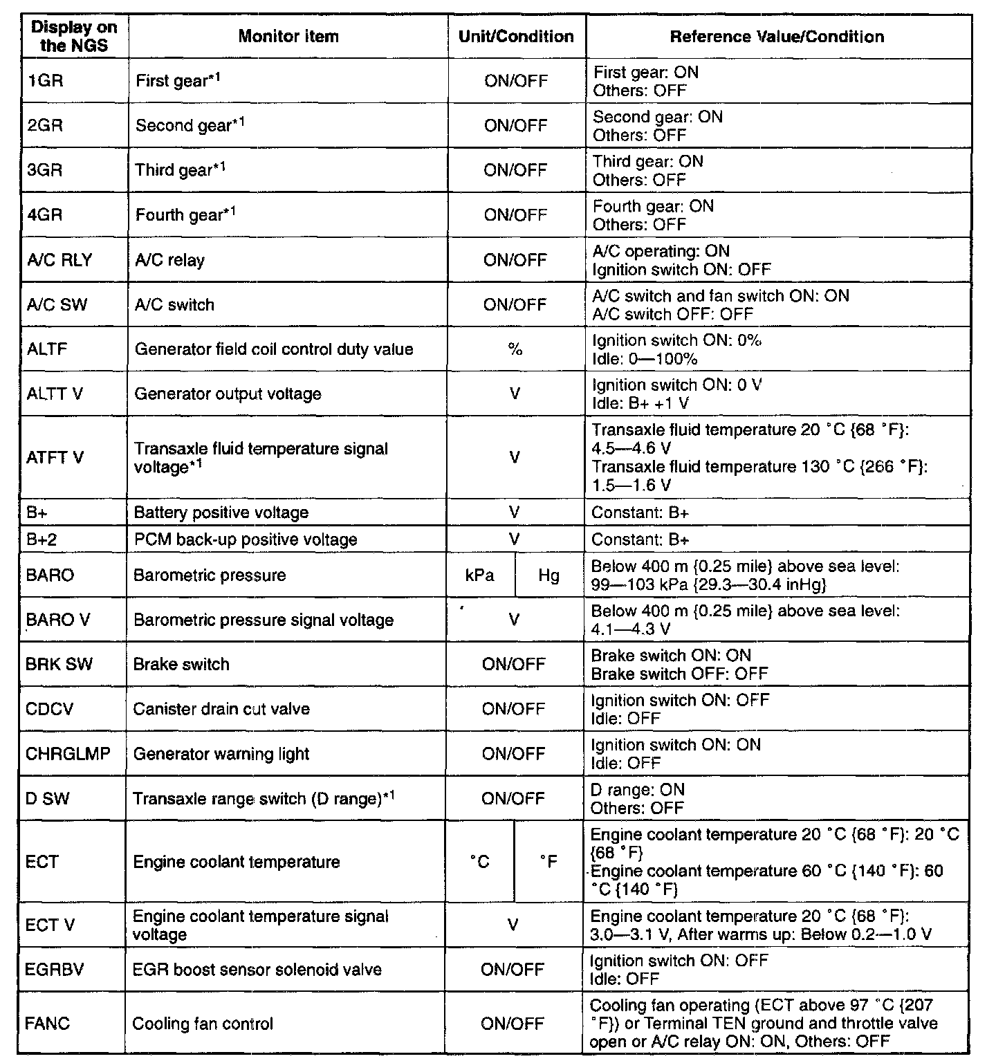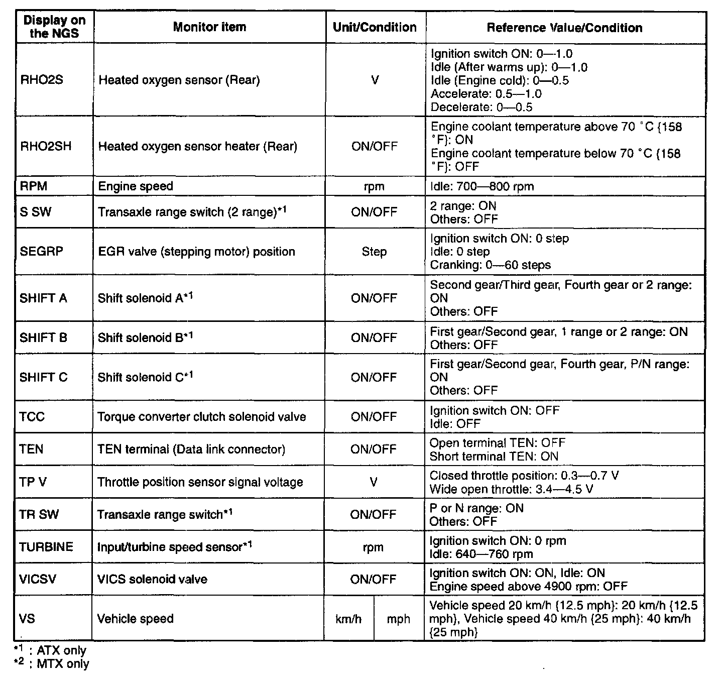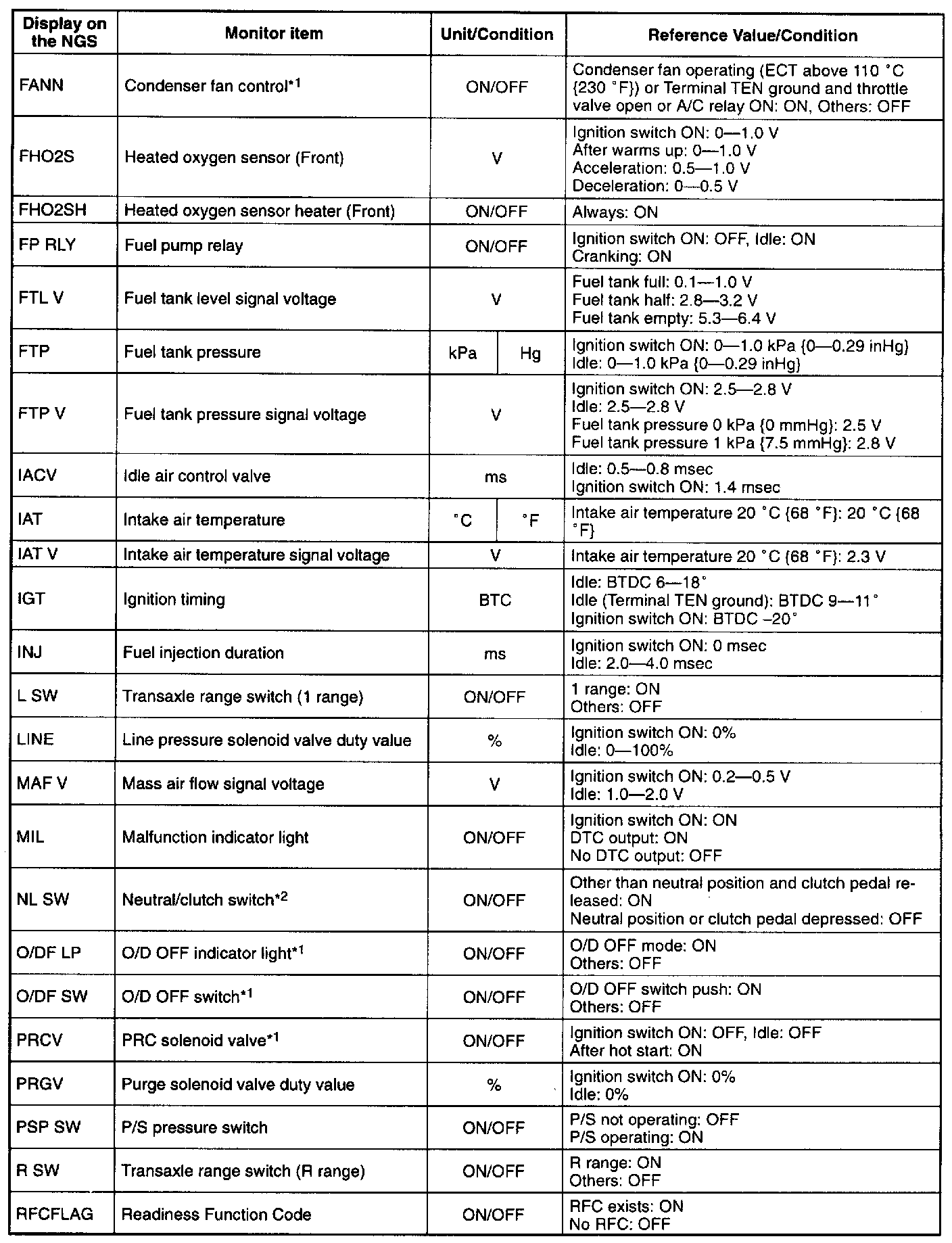 NOTE: The "PID/DATA MONITOR AND RECORD" function is to monitor the calculation value of input/output signals in the PCM. Deviation in the value does not always indicate malfunction in the related input/output devices (sensors and solenoids).