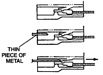 1. Insert a thin piece of metal from the terminal side of the connector, and press down the terminal locking tab.
