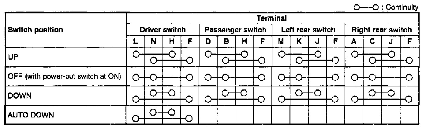 Inspect for continuity between the power window main switch terminals by using an ohmmeter.