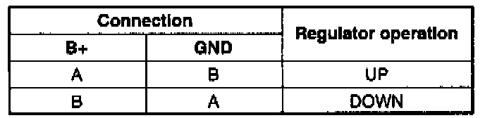 1. Remove the power window regulator.2. Apply battery positive voltage to the power window regulator connector terminals and inspect the operation of the regulator.