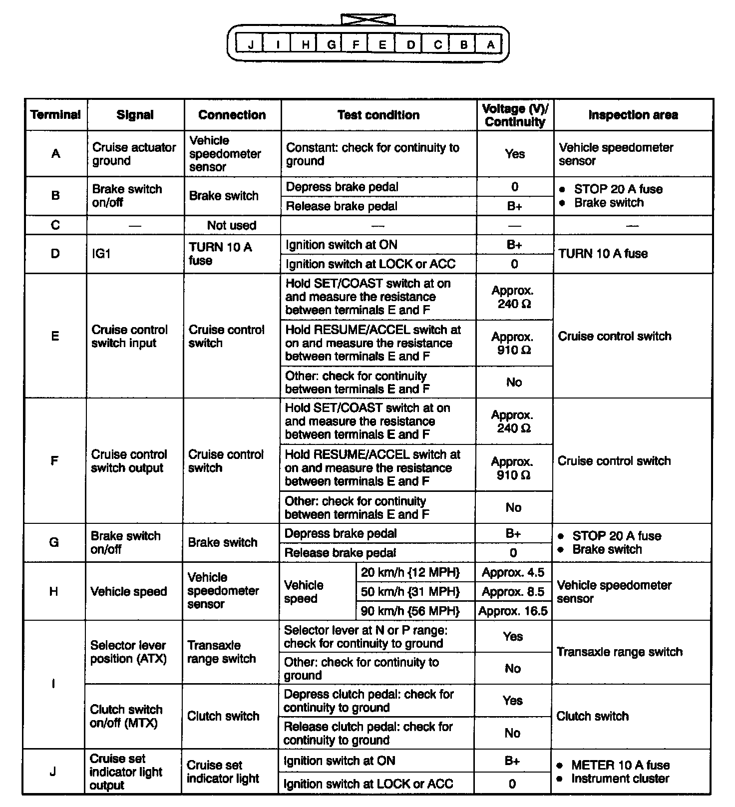 2. Disconnect the cruise actuator connector before checking for continuity at terminal A, E, F and I.