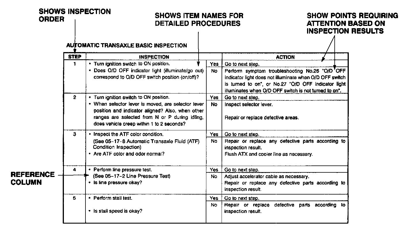 Although inspections and adjustments are performed according to the reference column procedures, if the cause of the malfunction is discovered during basic inspection, continue the procedures as indicated in the remarks column.