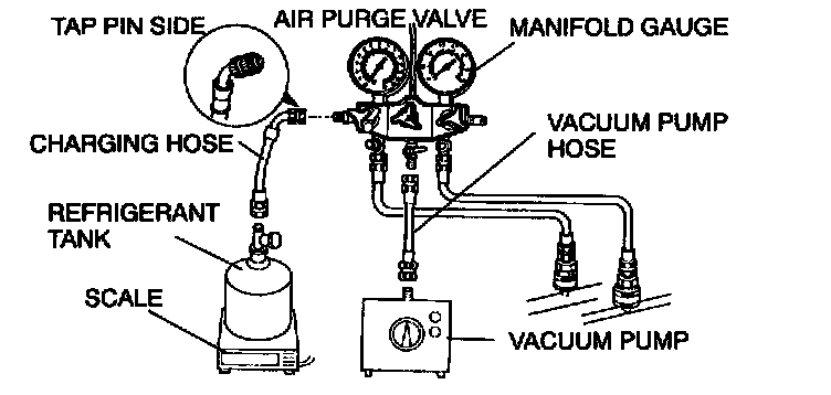 CAUTION: Close the manifold gauge valve immediately after stopping the vacuum pump. If the valve is left open, the vacuum pump oil will backflow Into the refrigeration cycle and cause a decrease in the efficiency of the air conditioner.