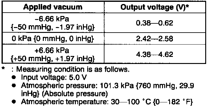 6. Decrease the applied pressure from +6.66 kPa (+50 mmHg, +1.97 inHg) to -6.66 kPa (-50 mmHg, -1.97 inHg) and verify that the PCM terminal 62 voltage decreases accordingly as specified.