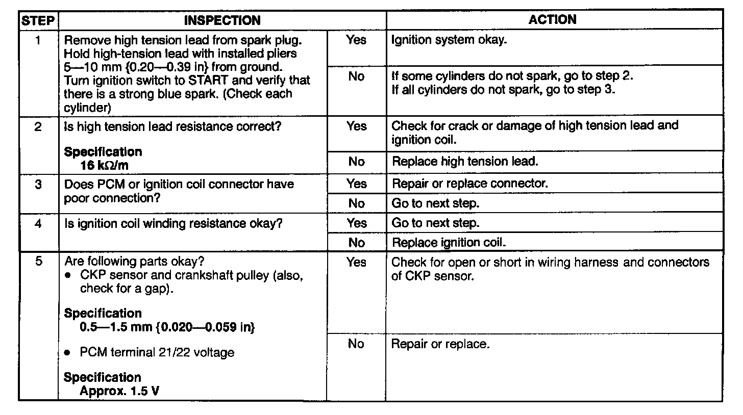 WARNING: High voltage in the ignition system can cause strong electrical shock which can result in serious injury. Avoid direct contact to the vehicle body during the following spark test.