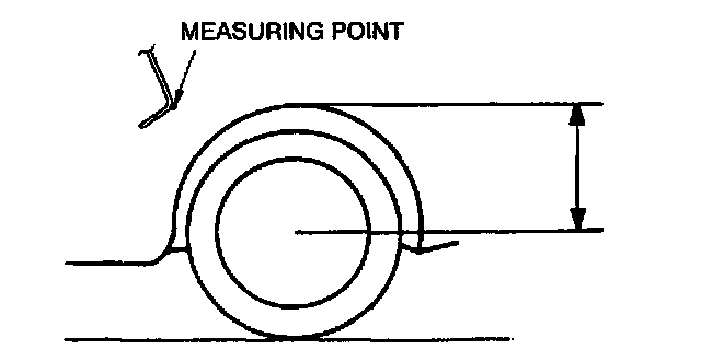 7. Measure the height from the center of the wheel to the fender brim. The difference between the left and right measurement must not exceed 10 mm {0.39 inch}.