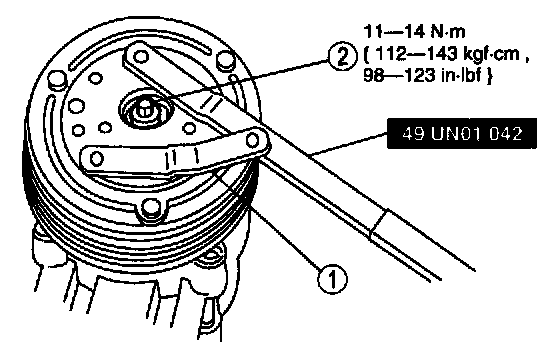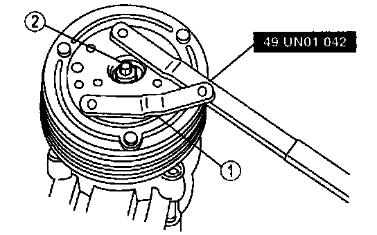 1. Hold the A/C clutch hub with the Spanner Wrench SST 49-UN-10 -042.