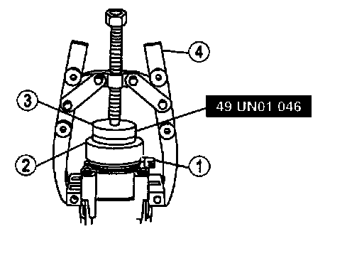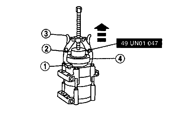 3. Install a 2-jaw puller on the compressor with tip of the puller forcing screw in the center pilot. Place the jaws of the puller around the back edge of the field coil. Tighten the puller forcing screw to pull coil from compressor.