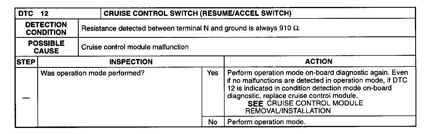 DTC 12 Cruise Control Switch (Resume/Accel Switch):