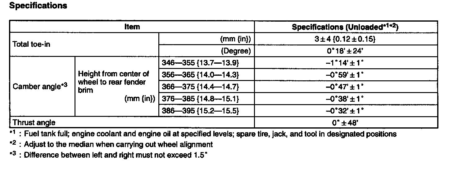 - Turning the front cam one graduation changes the toe-in about 2.3 mm (0.11 inch) and the camber about 13'. Turning the rear cam one graduation changes the toe-in about 2.3 mm (0.11 inch) and the camber about 8'.