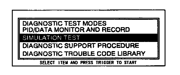 1. Perform steps 1 through 8 from the DTCs Reading Procedure.2. Turn ignition switch on. Move the cursor to SIMULATION TEST. Press the trigger key to enter this selection.