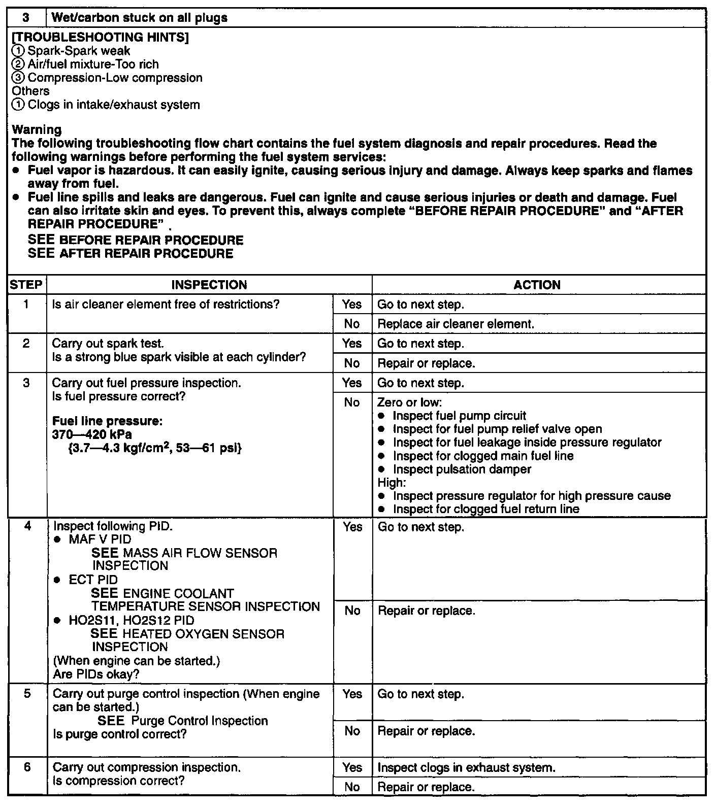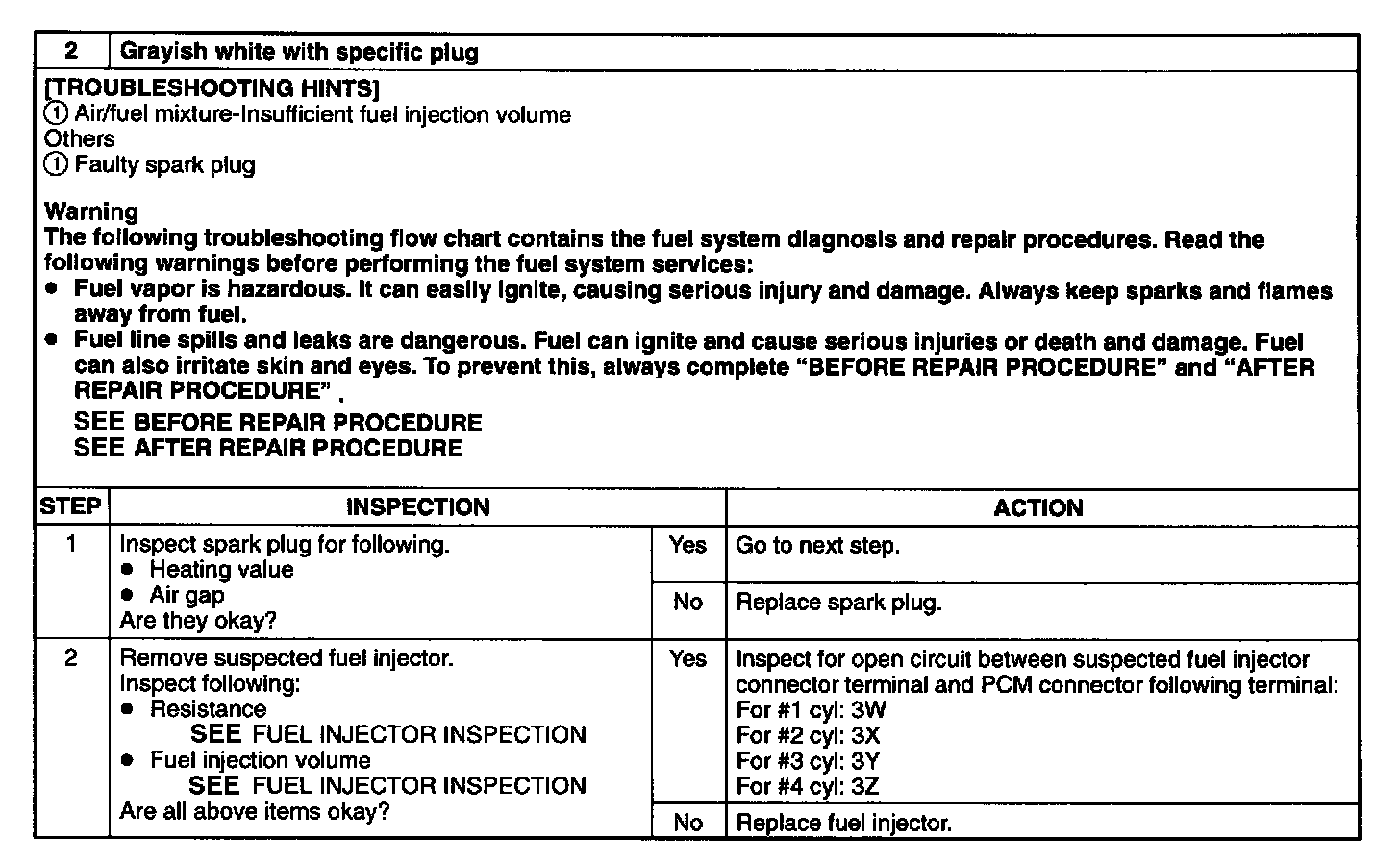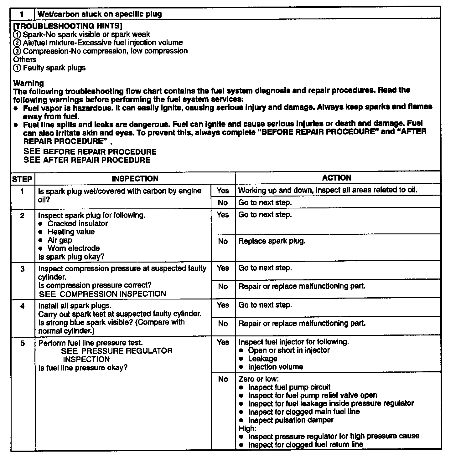 Spark Plug Condition Inspection PurposeInspecting spark plugs condition, can determine whether problem is related to a specific cylinder possibly all cylinders.