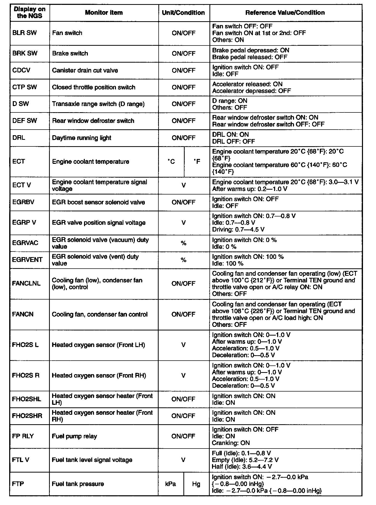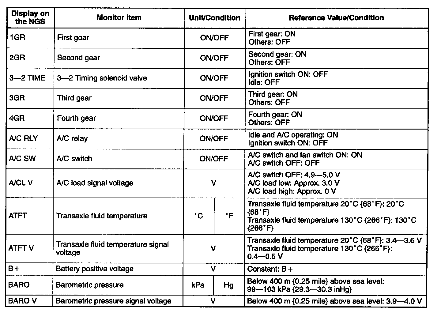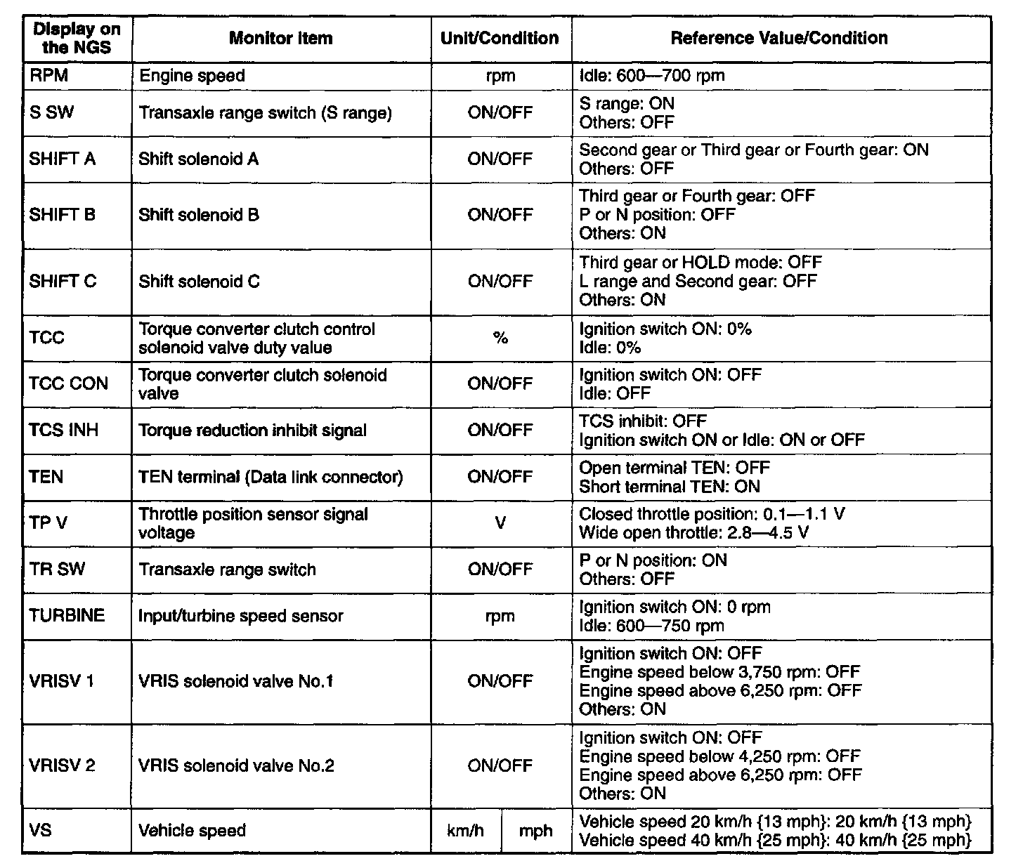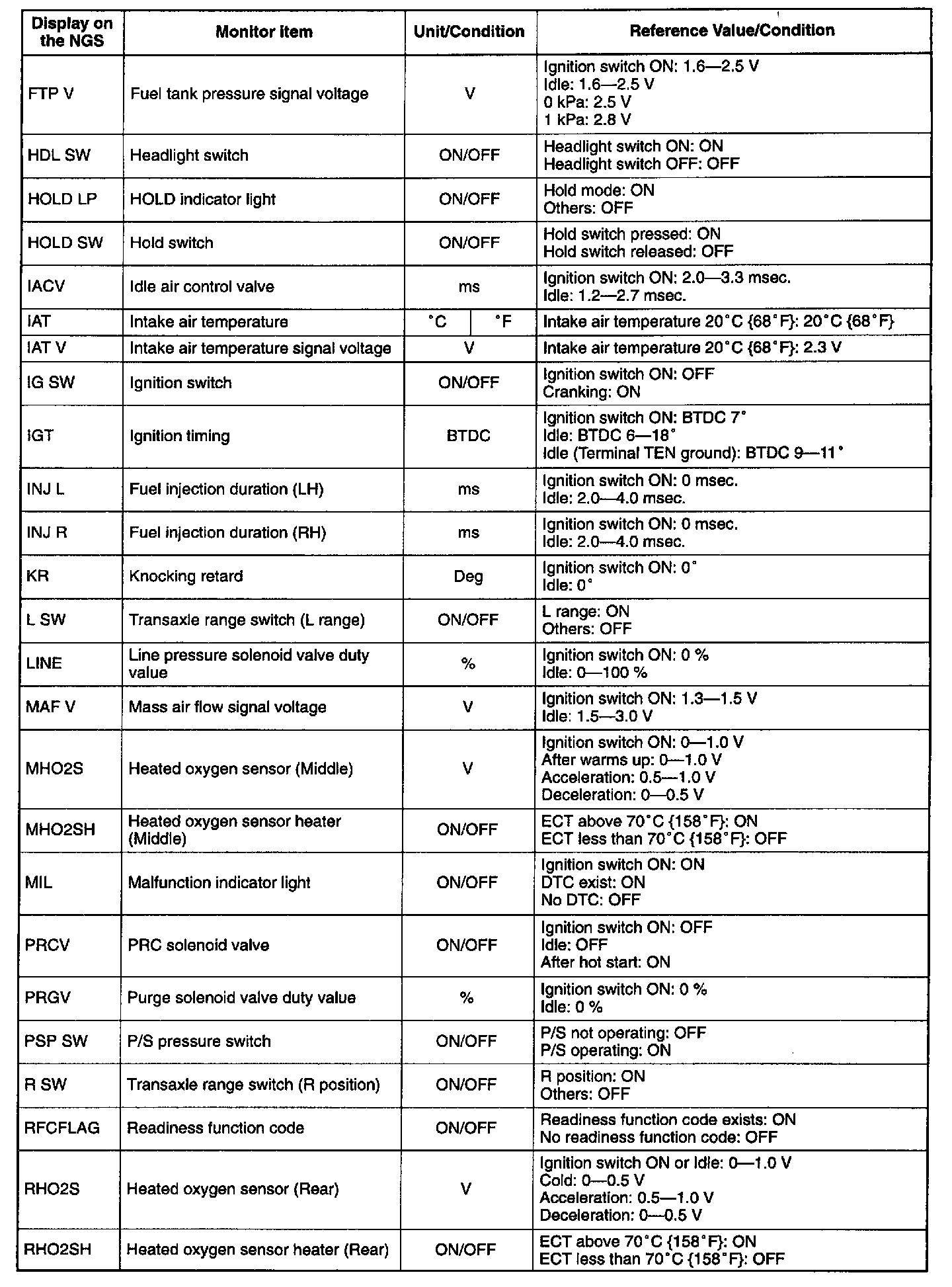 NOTE: The "PID/DATA MONITOR AND RECORD" function is to monitor the calculation value of input/output signals in the PCM. Deviation in the value does not always indicate malfunction in the related input/output devices (sensors and solenoids).