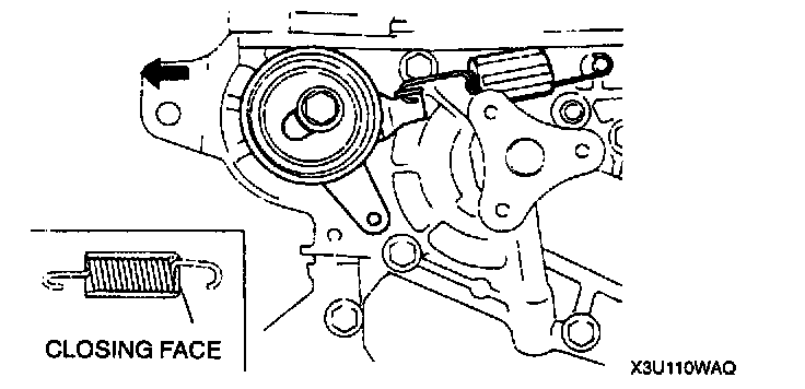 3. Install the tensioner spring with the damper rubber closing face on the right side.