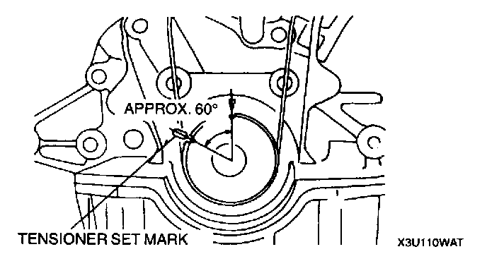 7. Verify that the timing belt pulley mark is aligned with the tensioner set mark.