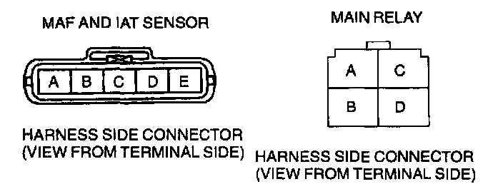 - Power circuit (MAF sensor connector terminal A and main relay terminal D through common connector to Ground)