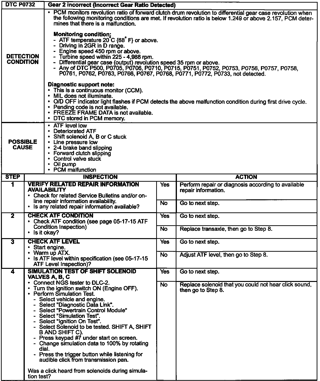 ^ If DTCs P0732, P0733, and/or P0734 re-appear, use the service diagnostics in this bulletin. A Workshop Manual update will be issued which will contain these diagnostics.