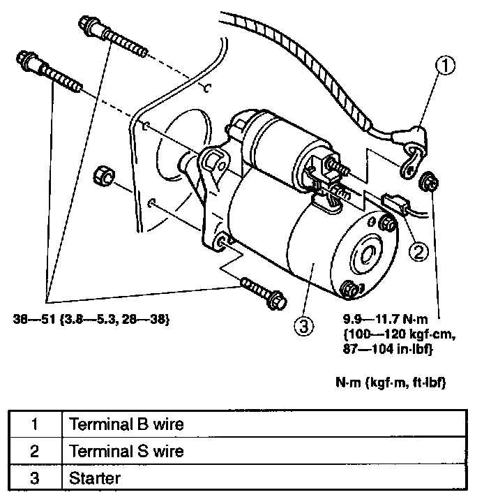 STARTER REMOVAL/INSTALLATIONWARNING: When the battery cables are connected, touching the vehicle body with starter terminal B will generate sparks. This can cause personal injury, fire, and damage to the electrical components. Always disconnect the battery before performing the following operation.