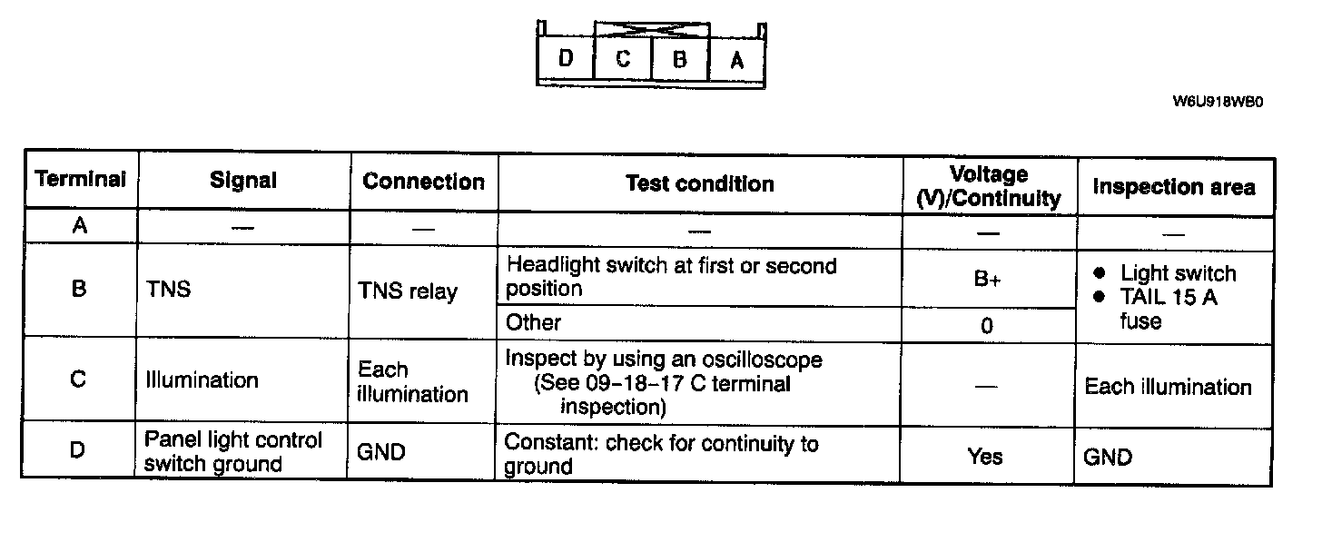 PANEL LIGHT CONTROL SWITCH INSPECTIONNOTE: Disconnect the panel light control switch connector before checking for continuity at terminal D.