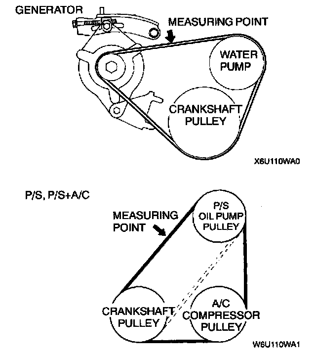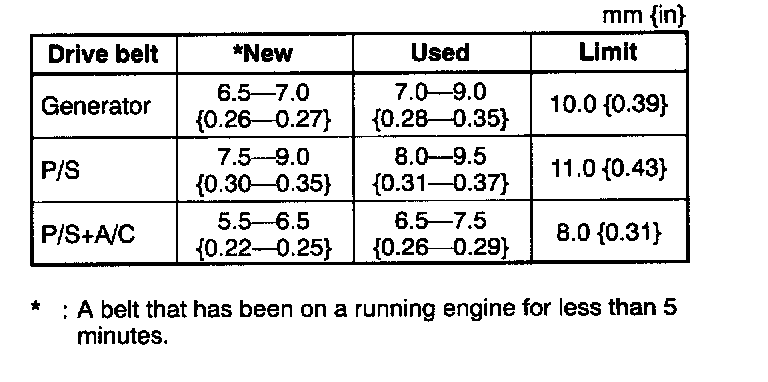 1. Verify the drive belt deflection when the engine is cold, or at least 30 minutes after the engine has stopped. Apply moderate pressure 98 N (10 kgf, 22 lbs.) midway between the specified pulleys.