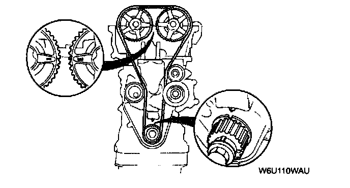 1. Verify that the timing belt pulley mark and camshaft pulley marks are aligned with the timing marks as shown.