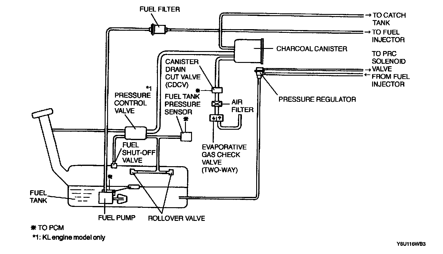 The EVAP control system prevents fuel vapor from releasing to the atmosphere and consists of the following: