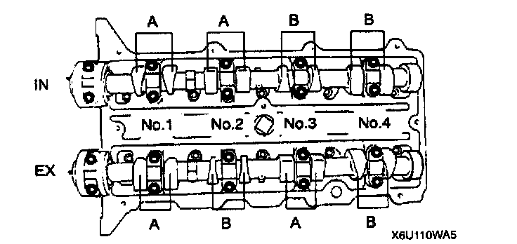 4. Measure the valve clearance at B in the figure. If the valve clearance exceeds the standard, replace the adjustment shim.