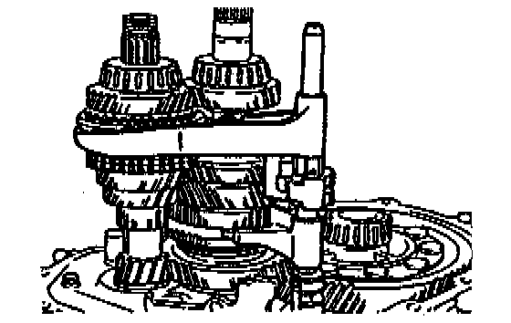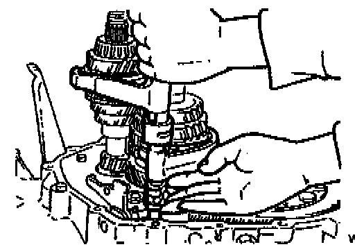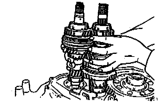 2. While holding the 1st/2nd shift fork with one hand and the 3rd/4th shift fork with the other, raise them both at the same time and shift each of the clutch hub sleeves.