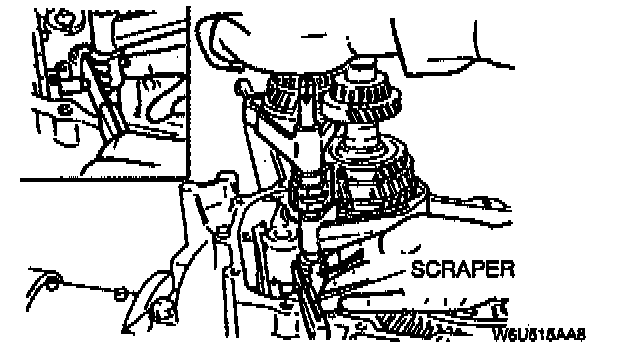 2. Insert the spring seat and spring into the reverse lever shaft. Install the steel ball, and place a scraper so that it contacts the steel ball.