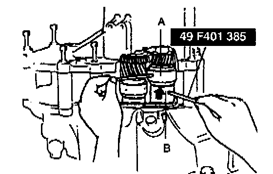 10. To seat the bearings, mount the SST (49 F401 385) on parts A and B of the SSTs (49 F401 382A and 49 G030 382A), and turn the SSTs so the gaps are widened. Then turn the SSTs in the reverse direction until the gaps are eliminated.