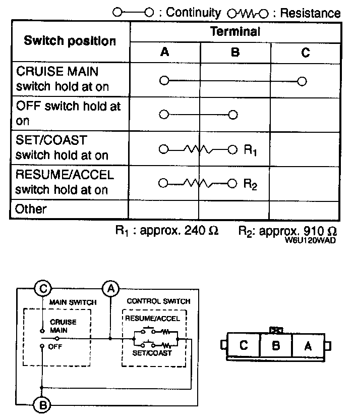 4. Measure the resistance and check for continuity between the cruise control switch terminals by using an ohmmeter.