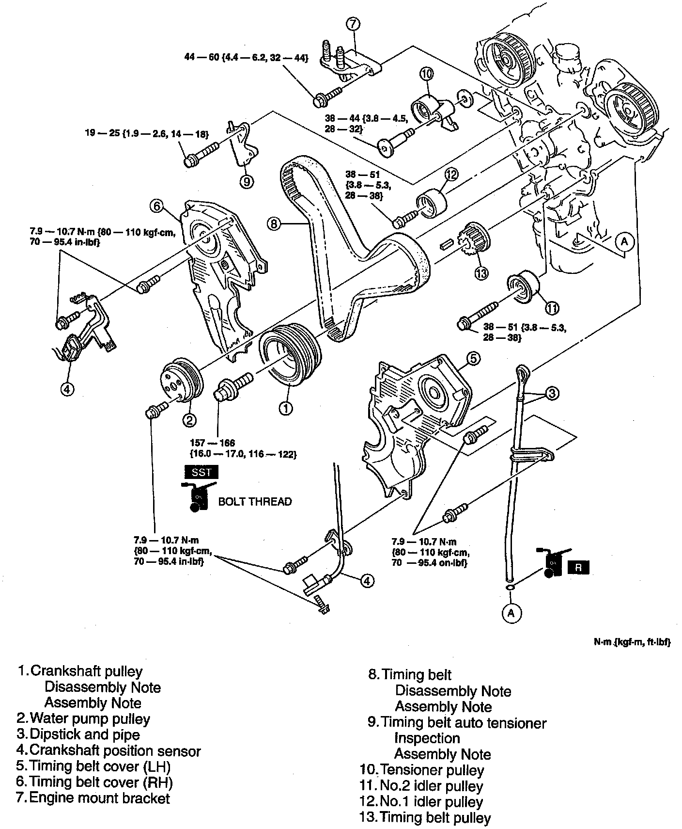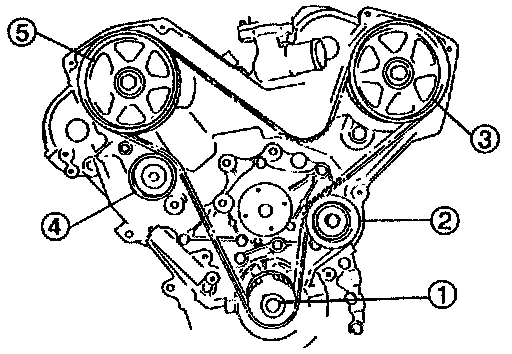 2. With the No. 1 idler pulley removed, install the timing belt on the pulleys in the order described below.