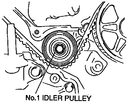 4. Install the No. 1 idler pulley while applying the pressure on the timing belt.