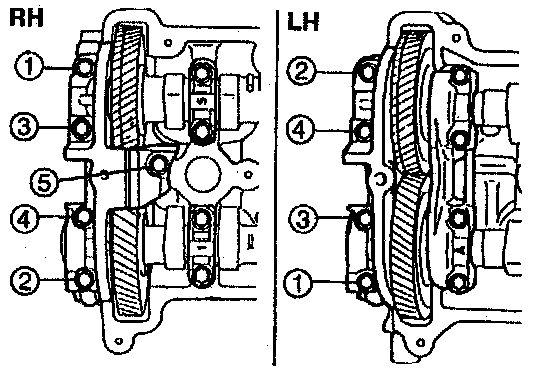 CAUTION: Install the thrust caps (RH is [4] mark, LH is [A] mark) first. Otherwise, camshaft can be broken or damaged.
