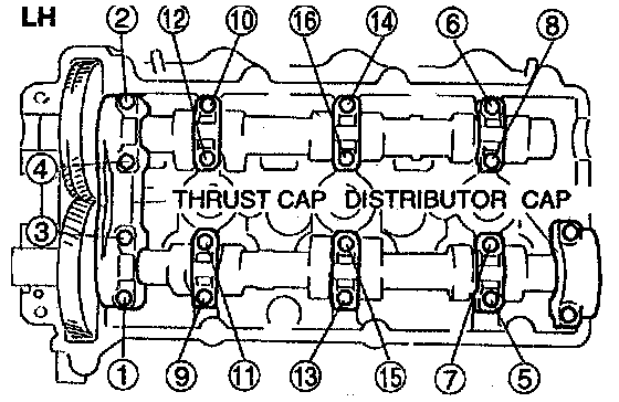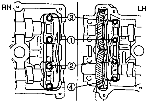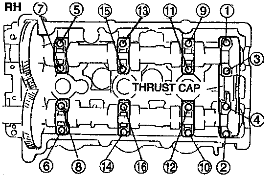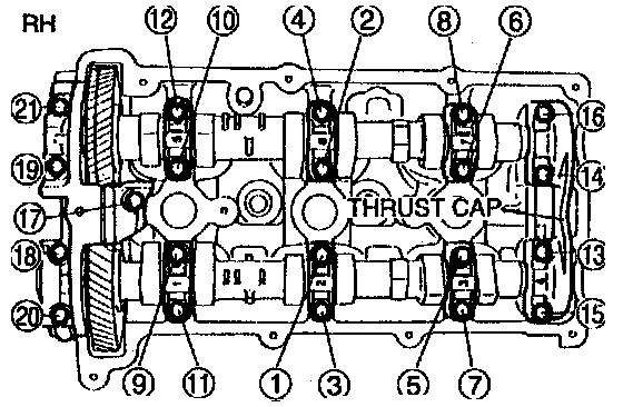 3. Loosen the camshaft cap bolts in five or six steps in the order shown.