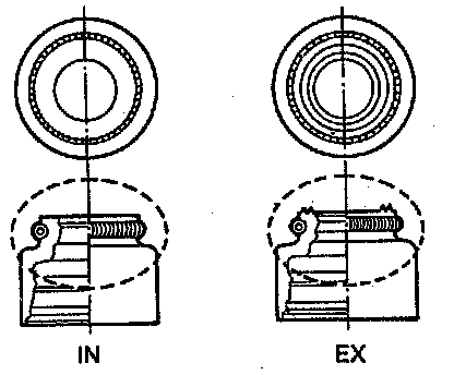 NOTE: The intake and exhaust valve seals are different as shown. The exhaust valve seal has ridges on the top for identification.