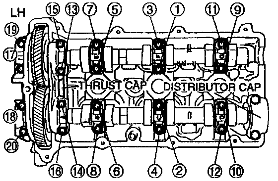 6. install the camshaft caps onto the cylinder heads. Hand tighten the bolts in five or six steps in the order shown, until the camshaft caps fully seated on the cylinder heads.