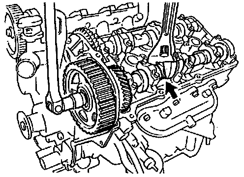 1. Hold the camshaft by using a wrench on the cast hexagon as shown, and loosen the camshaft pulley lock bolt.
