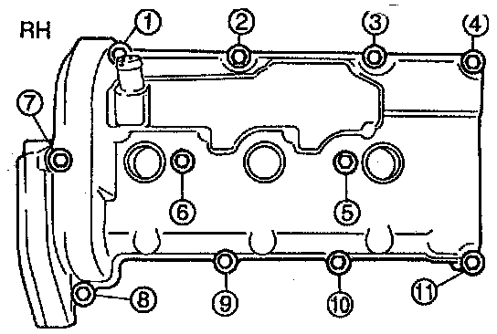 5. Retighten RH (5) (6) and LH (6) (7) cylinder head cover bolts.