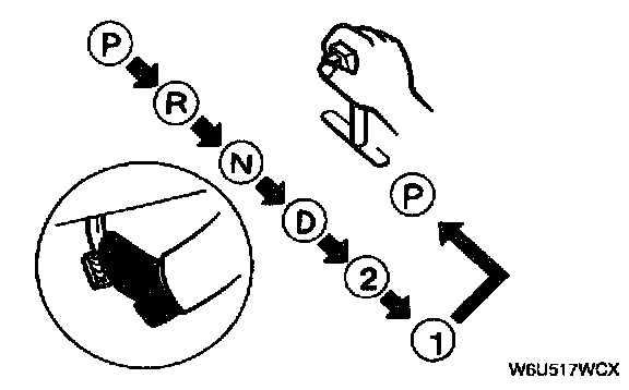 5. While depressing the brake pedal, shift the selector lever to each range (P-1), pausing momentarily in each range.