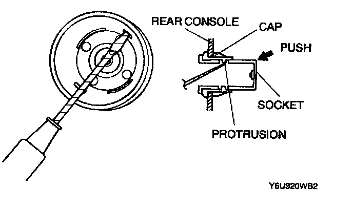 1. While pushing the protrusion through one of the holes using a tape-wrapped flathead screwdriver, push the back of the socket to disengage the cap from the socket.