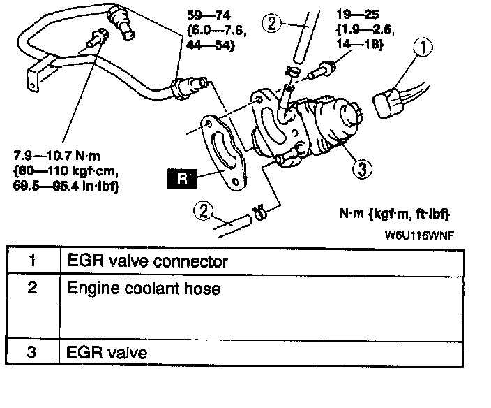 WARNING: Do not remove the EGR valve with the engine hot. Engine coolant in the EGR valve may badly burn or injure. Always remove and install the EGR valve when the engine is cold.1. Remove in the order indicated in the table.