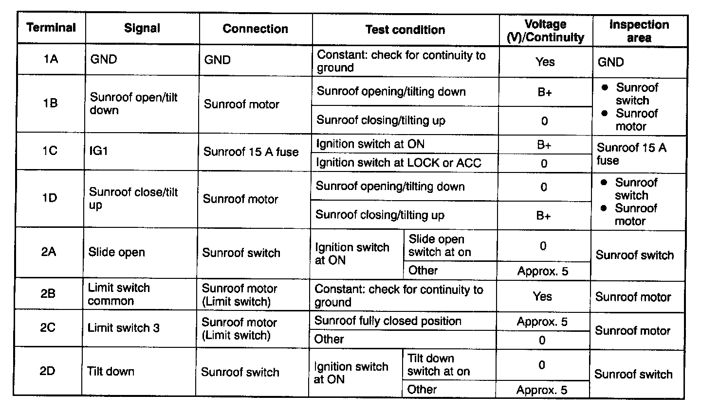 4. Disconnect the sunroof control module connector before checking for continuity at terminal 1A and 2B.