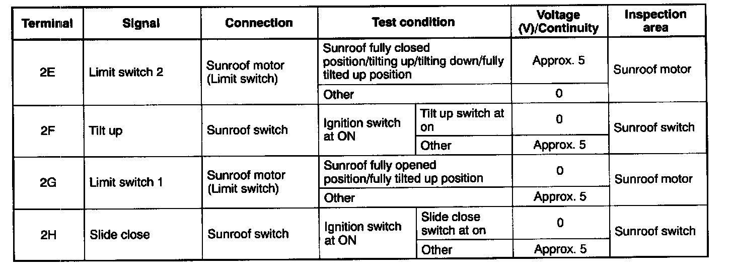 3. Measure the voltage at the sunroof control module terminals as indicated.