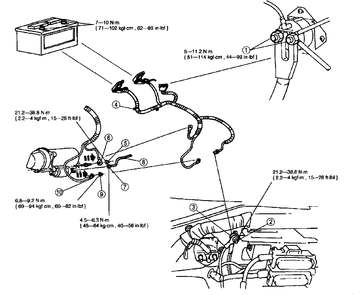 1. Remove the starter motor ground cable nut (5) and disconnect the starter motor ground cable (6).