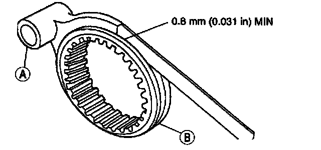 1. Check the contact surface of the (A) shift fork and (B) synchronizer sleeve for wear or damage