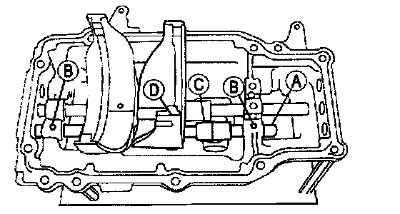 5. Position the (B) detent ball and spring, the (C) shift gate, the (D) shift fork and spring and install the (A) first/second shift rail.